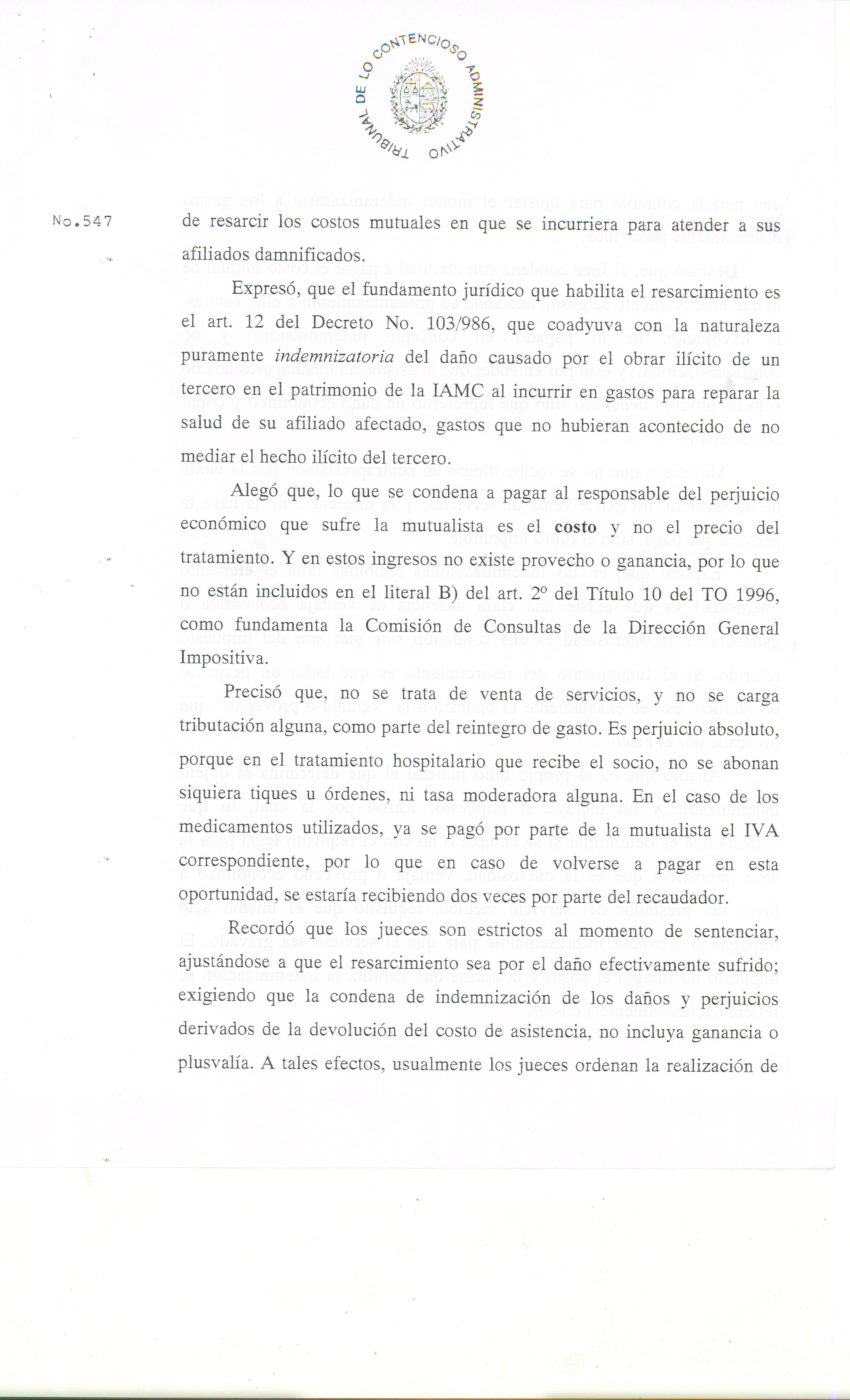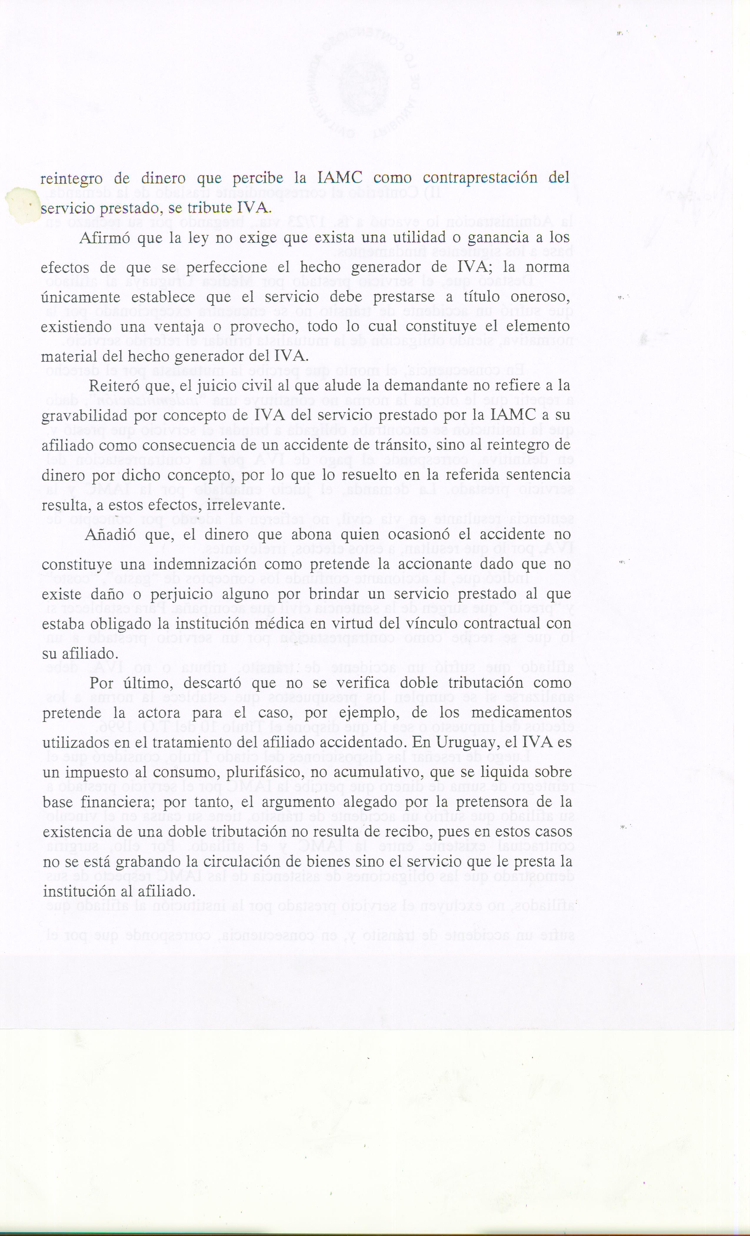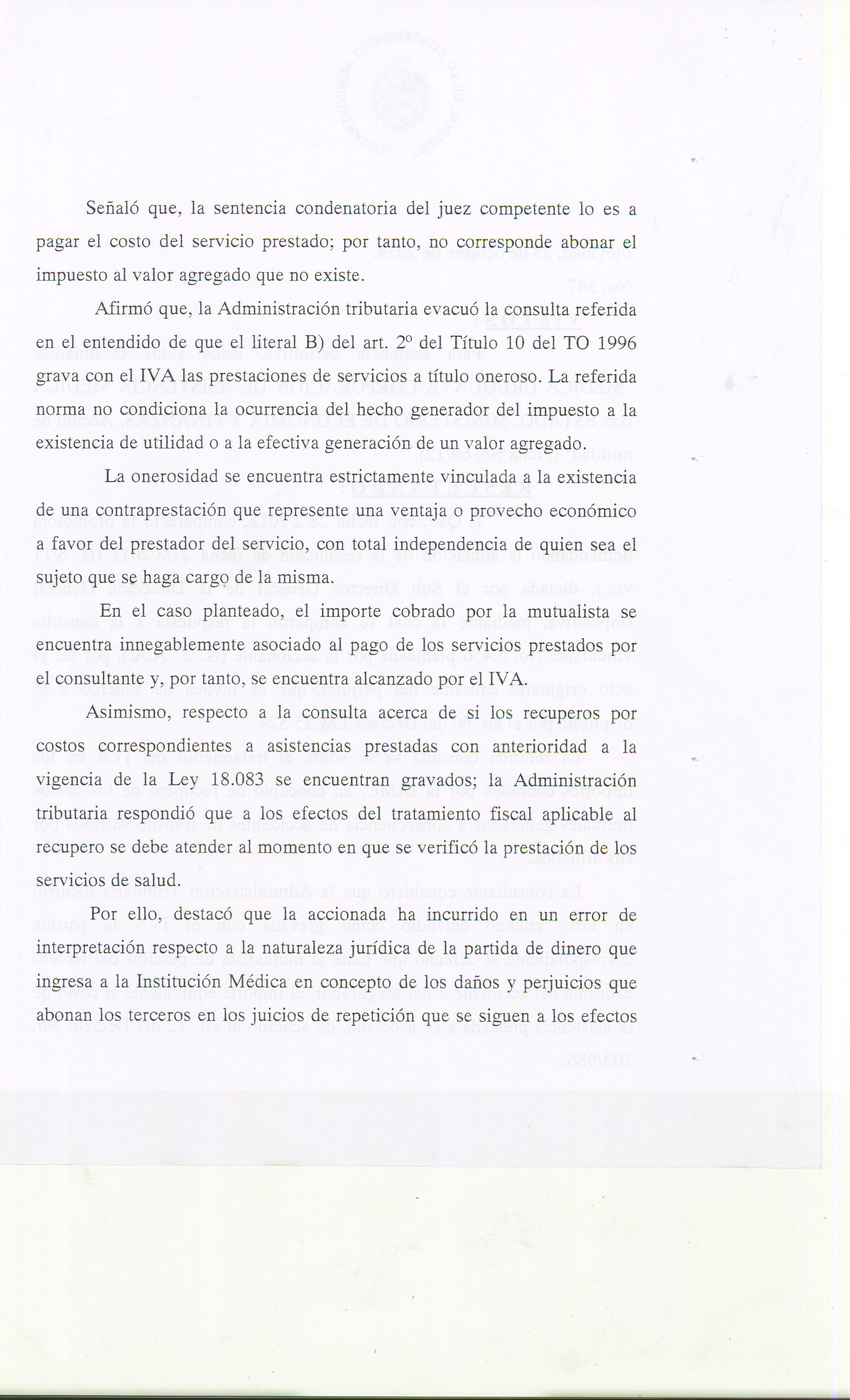 La misma constituye la primera en su especie y determinó que la IAMC actora no debía al Organismo Recaudador el pago del I.V.A por los Recuperos Mutuales, ya que la indemnización que perciben las Mutualistas por los costos que insumen los accidentes de tránsito responsabilidad de terceros no configura el hecho generador del impuesto.